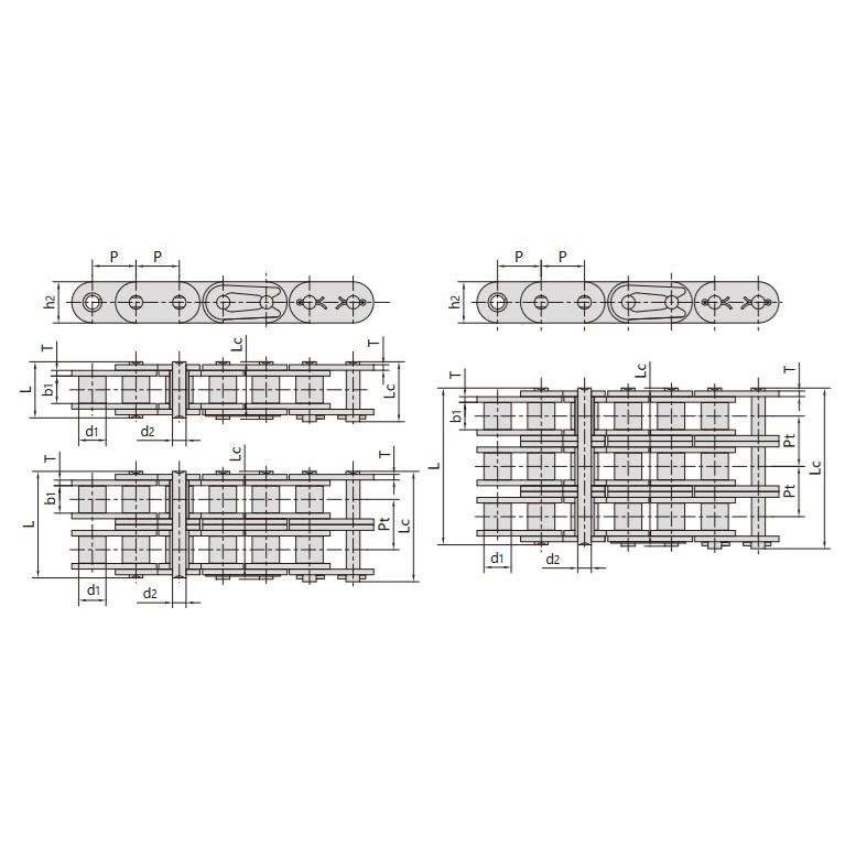 Sorozatú görgős láncok egyenes oldalsó lemezekkel műszaki táblázat