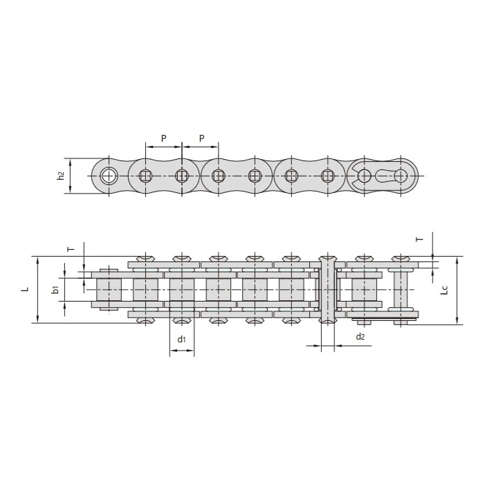 - Belső lánclemezek és csapok:Több pár belső lánclemez van összekötve csapokkal, ami biztosítja a robusztus és stabil erőátvitelt.