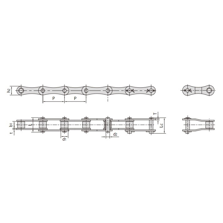 - Kettős osztású kialakítás:A lánc osztása kétszerese a standard rövid osztású görgős láncokénak, így könnyebb, miközben megőrzi szilárdságát. Ideális hosszabb szállítási távolságokhoz, alacsonyabb sebességekhez és hosszabb hajtásközpont-távolságokhoz.